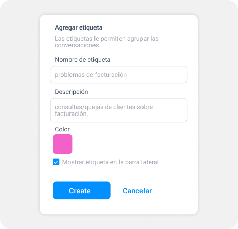 Crea tus etiquetas en FasiaCRM una sola vez. Asígnales un nombre, descripción y un color distintivo. Así de sencillo es organizar tus conversaciones. Y recuerda, siempre puedes modificarlas.