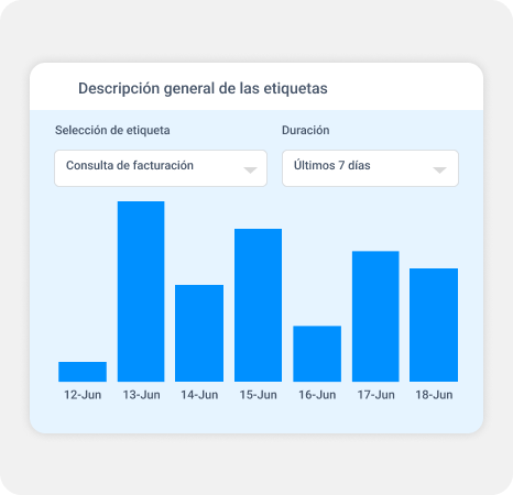 En tu panel de control, accede y descarga tu Informe de Etiquetas. Selecciona una etiqueta específica para ver métricas relacionadas: cantidad de conversaciones, mensajes, tiempo de primera respuesta, duración de la resolución y más.